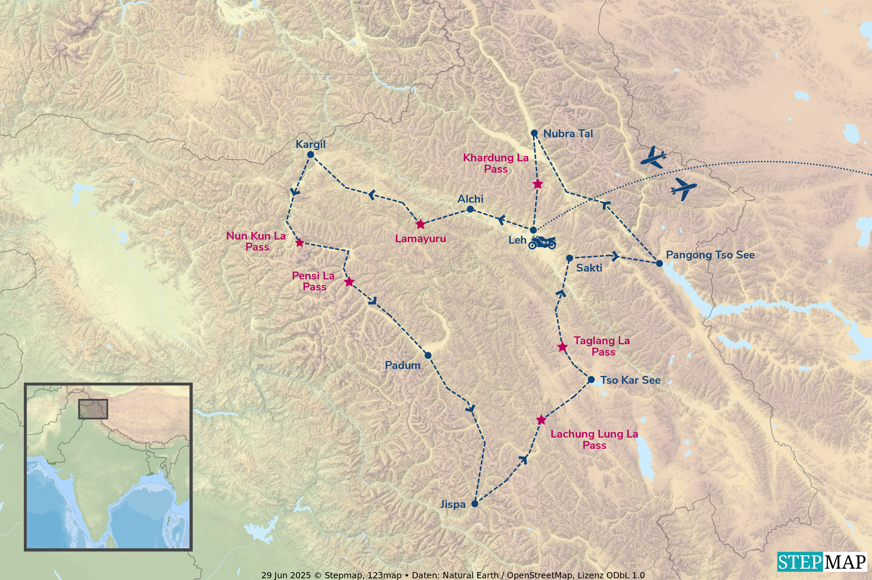 Ein unvergessliches Erlebnis wird die Überquerung dreier Pässe, die zu den höchsten der Welt gehören - dem 5608 m hohen Khardung La und dem erst in 2022 eröffneten Shingo La Pass. Der eine Rundtour über Padum in Zanskar nach Darcha in Lahaul ermöglicht.
