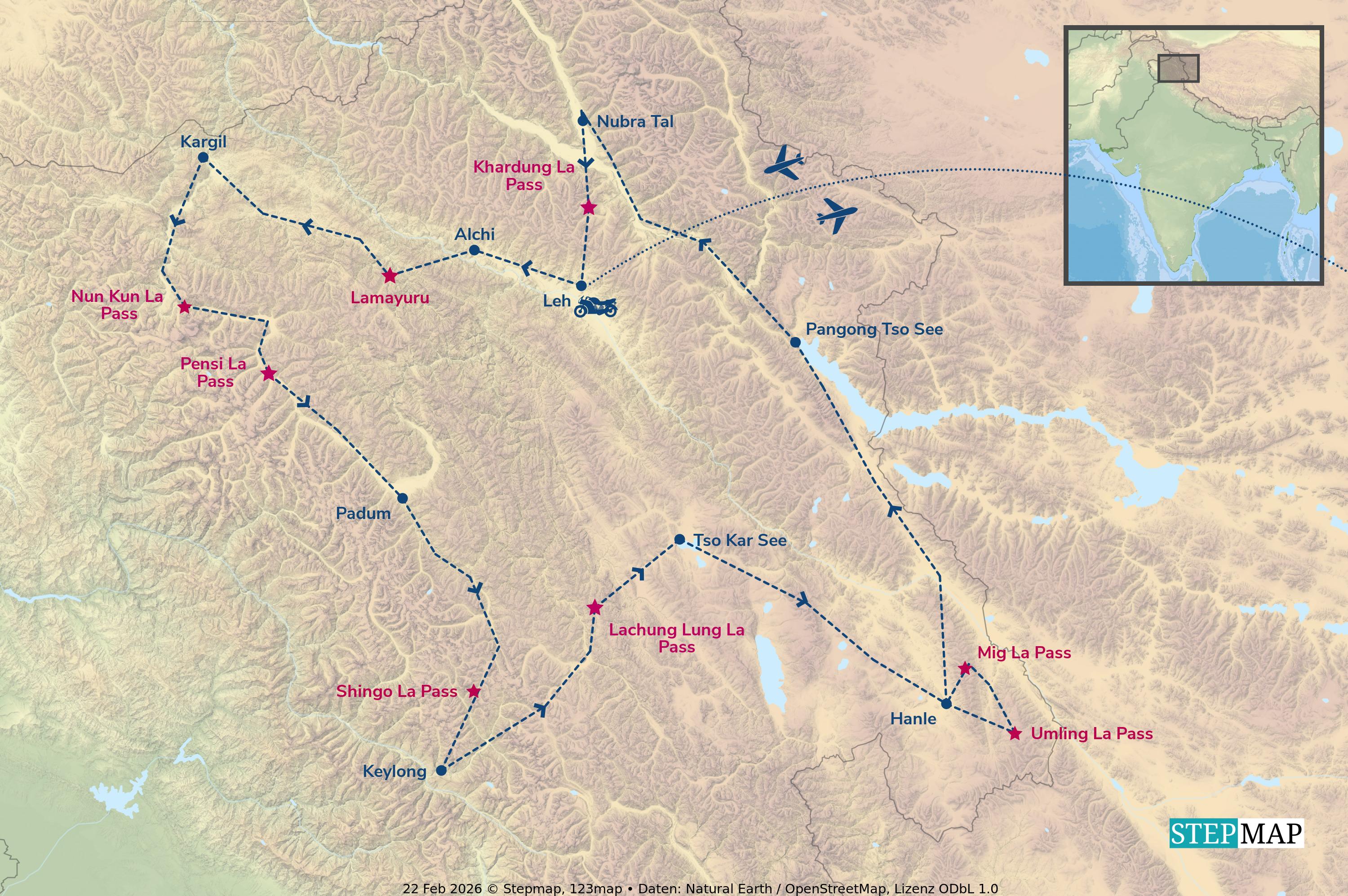 Der Klassiker unser Ladakh-Motorradreisen kommt dieses Jahr mit einem neuem Routing daher, das als unvergessliches Erlebnis die Überquerung der drei höchsten Pässe der Welt beinhaltet: den 5.608 m hohen Khardung La, den erst in 2023 eröffneten Umling La auf 5.800 n und wenn uns Wetter und Behörden hold sind - das absolute Highlight - der Mig La auf 5.913 m!