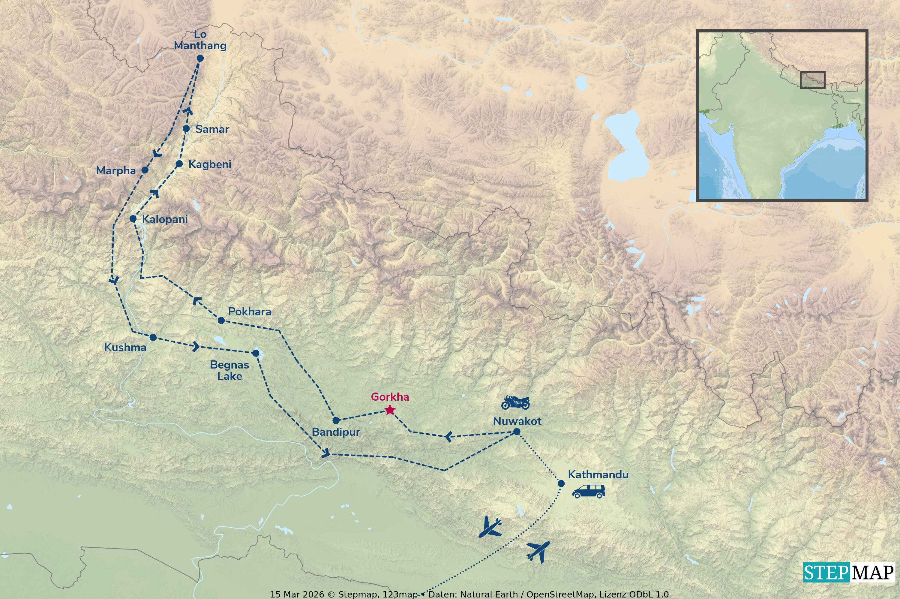 ACHTUNG: Es wird ein VISA benötigt. Diese kann bei Ankunft am Flughafen oder online (eVisa) beantragt werden. Für Upper Mustang werden spezielle Permits benötigt, die von uns organisiert werden.